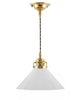 Klassisk skomagerlampe i messing med hvid opalglasskærm. Skjult loftbeslag til fast installation medfølger.