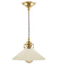 Klassisk skomagerlampe i messing med benhvid opalglasskærm. Skjult loftbeslag til fast montering medfølger.