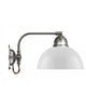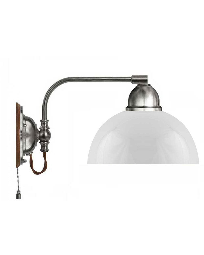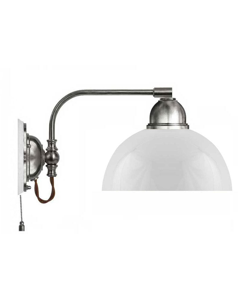 Klassisk væglampe i forniklet messing med opalhvid glasskærm og brunt tekstilkabel.
