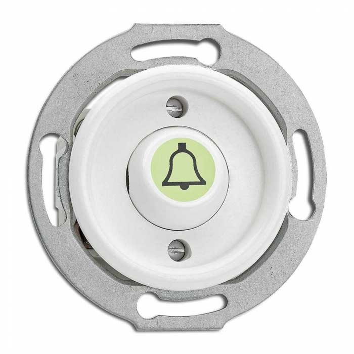 Signaltaster aus weißem Duroplast ohne Rahmen mit federndem, selbstleuchtendem Knopf, der zusammen mit einem angeschlossenen Relais als Türklingeltaster oder Schalter fungiert. Relais mit Timerfunktion nicht enthalten. Der Schalter hat ein Uhrensymbol und ist zum Einbau in eine Wand vorgesehen. Die Klingel und der Transformator sind nicht im Lieferumfang enthalten und müssen separat bestellt werden, siehe unten unter Ähnliche Produkte.