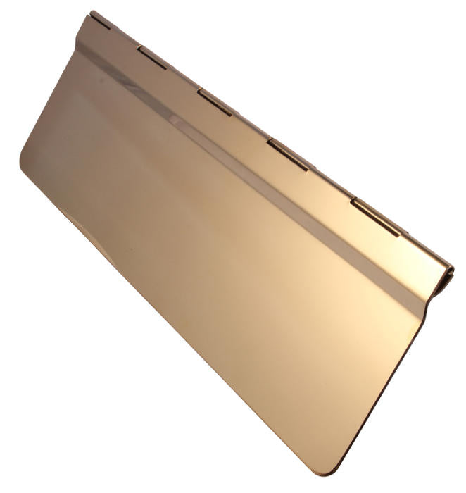Auf der Rückseite hat dieses Rückenteil am oberen Rand 5 vorgebohrte Löcher zur Montage an der Türinnenseite. Es besteht aus echtem Messingblech, das nicht schutzlackiert ist, wodurch es natürlich altert und mit der Zeit nachdunkelt. An der Oberkante befindet sich ein Scharnier mit einer Feder, das die Klappe geschlossen hält.