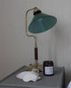 Elegante Tischlampe aus Messing mit grünem Glasschirm und 1,5 Meter langem, schwarzem Textilkabel. Die Lampe ist inspiriert von Modellen aus dem frühen 20. Jahrhundert. Das unbehandelte Messing wird nachdunkeln und eine schöne Patina entwickeln.