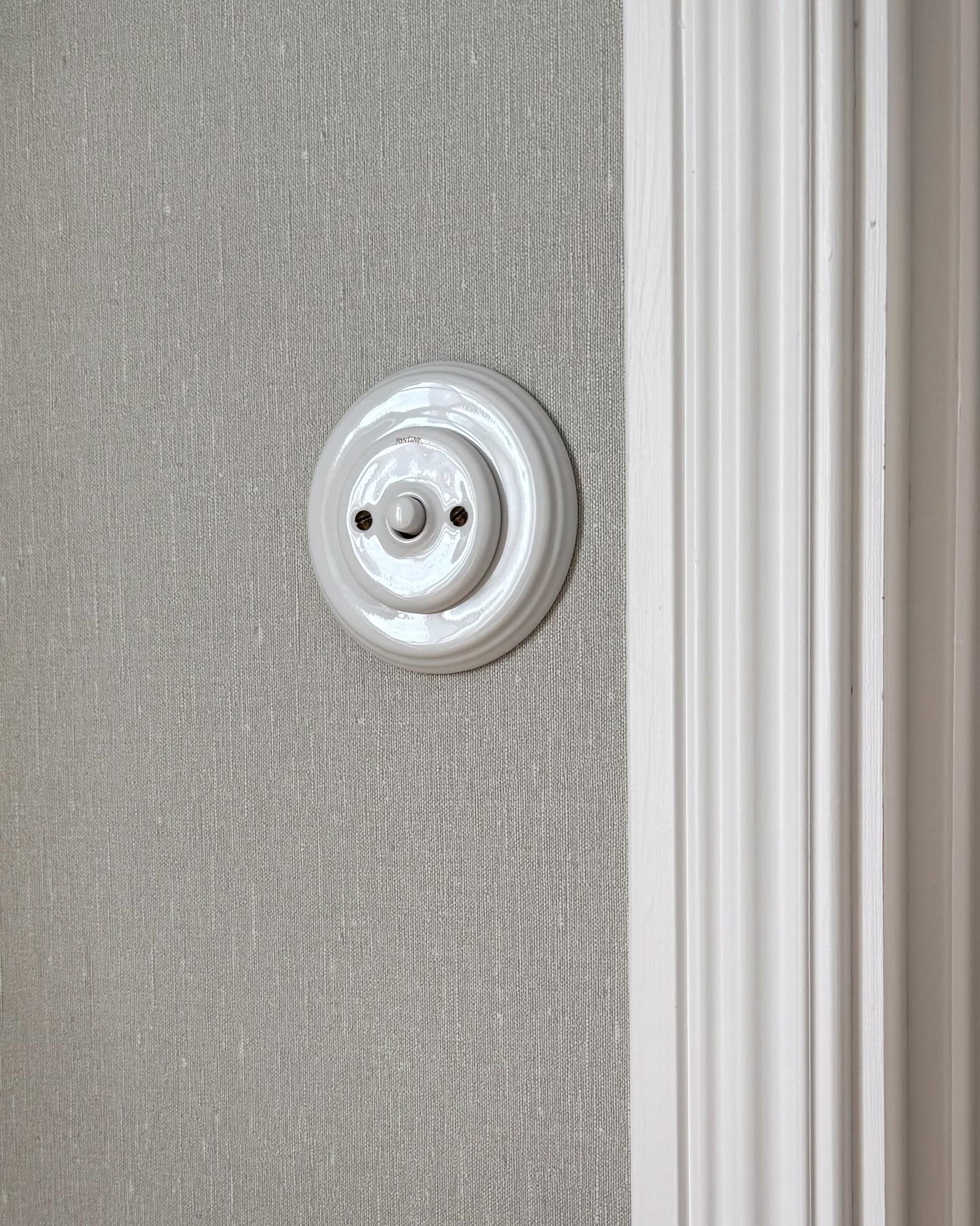 Druckschalter mit Dimmfunktion aus weißem Porzellan. Der Schalter ist rückfedernd und wird mit einem Dosendimmer geliefert, der in einer Einbaubuchse installiert wird.