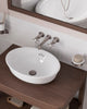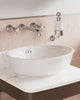 Aufsatzwaschbecken aus der Guild-Serie, entwickelt zur Platzierung auf einem Waschtischunterschrank oder einer Arbeitsplatte. Im Gegensatz zu vielen ähnlichen Modellen verfügt dieses Waschbecken über einen integrierten Überlauf.