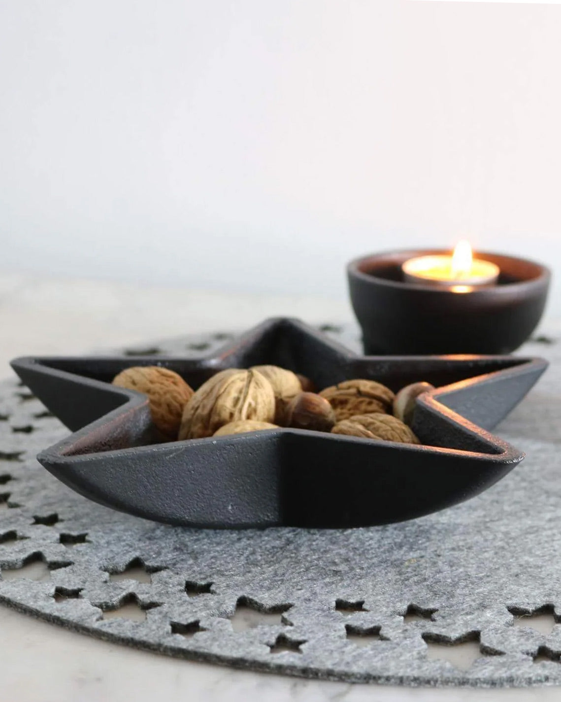 Eine kleine sternförmige Schale aus Gusseisen. Die Schale kann auch als Kerzenhalter für Stumpenkerzen verwendet werden.