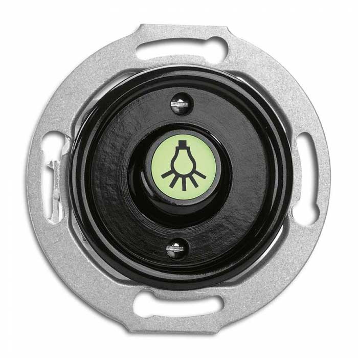 Switch insert in black bakelite without grame. Glow-in-the-dark rocker button in black bakelite which works as a switch if connected to a relay circuit. It should be used in hallways, entrances, etc. where there is a need for automatic switch-off of the light after a few minutes. Relay circuit with timer functionality is not included. The button has a light symbol and is for fixed mounting into the wall.
