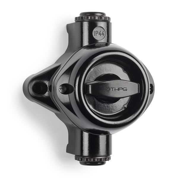Two-way switch in black bakelite with safety rating IP44 for tough and humid environments.