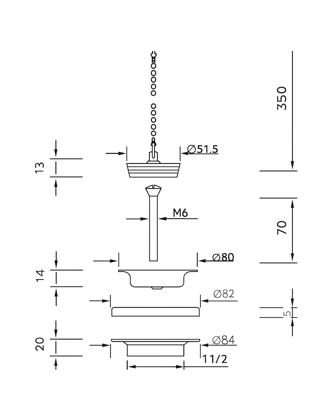 Stylish drain valve with plug and chain. The drain valve is designed for sinks and fits the standard size 1 ½''. It is suitable for sinks both with and without an integrated overflow. For detailed measurements, see image.
