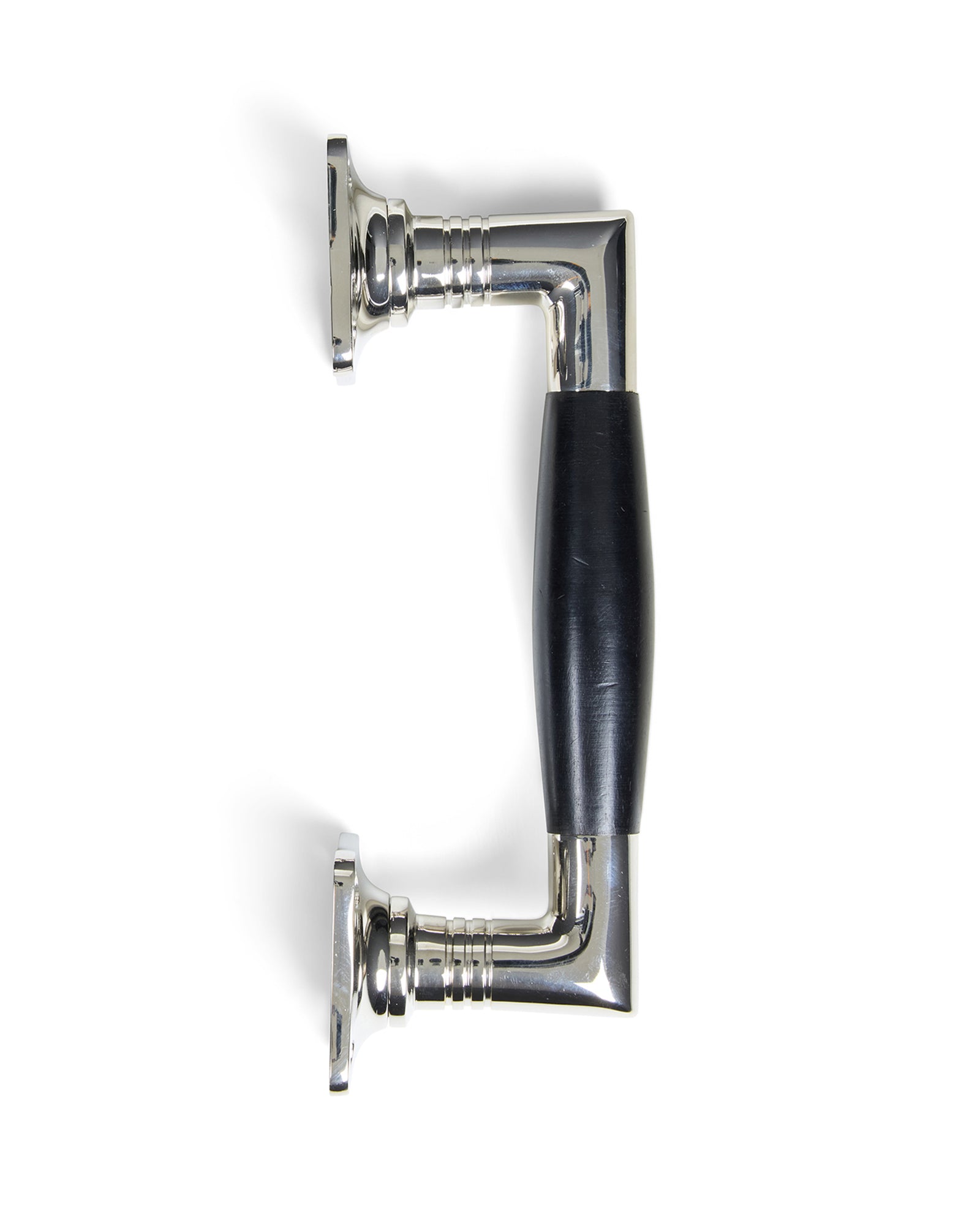 Beautiful pull handle in nickel-plated brass with a black wooden grip for doors, large drawers, or kitchen cabinets.