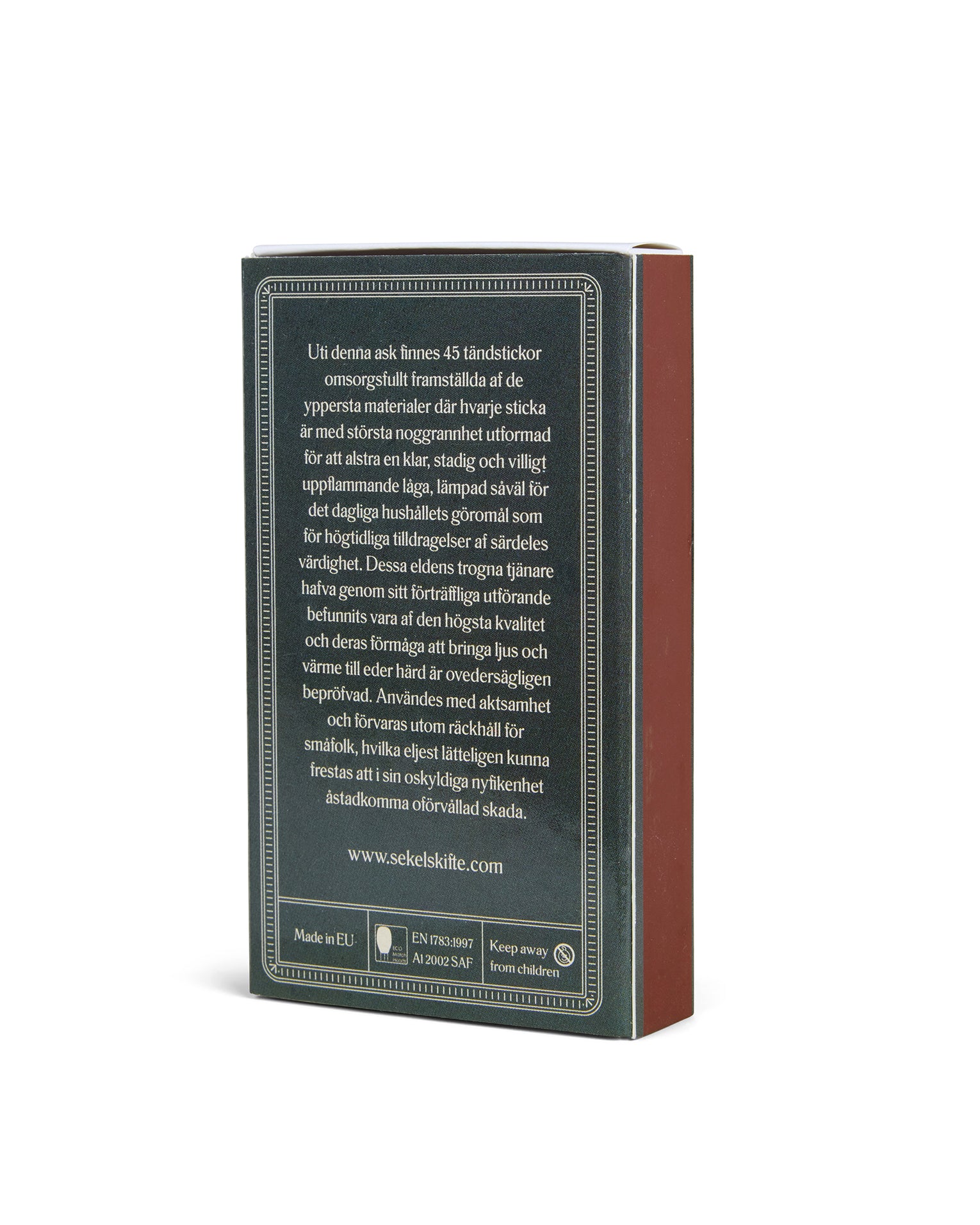 Our own matchbox containing 45 extra-long matches. The matches are manufactured in the EU and are safety matches, meaning they can only be ignited against the striking surface. The box is 100% biodegradable.
