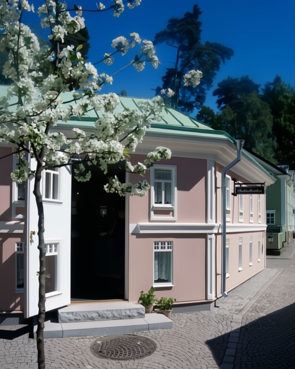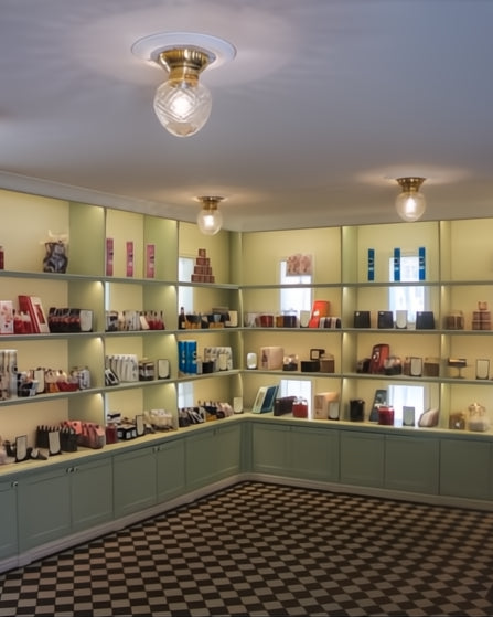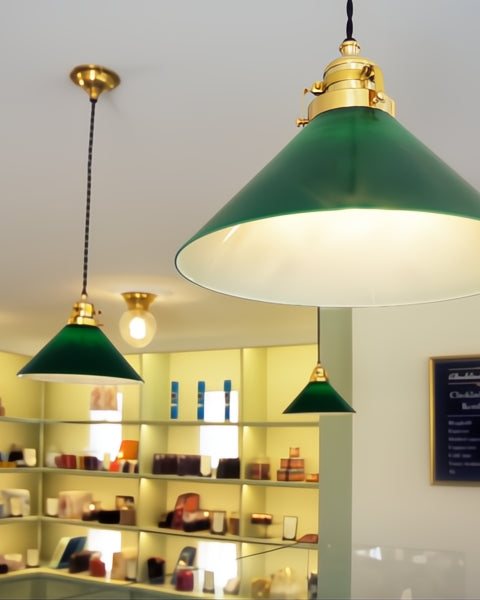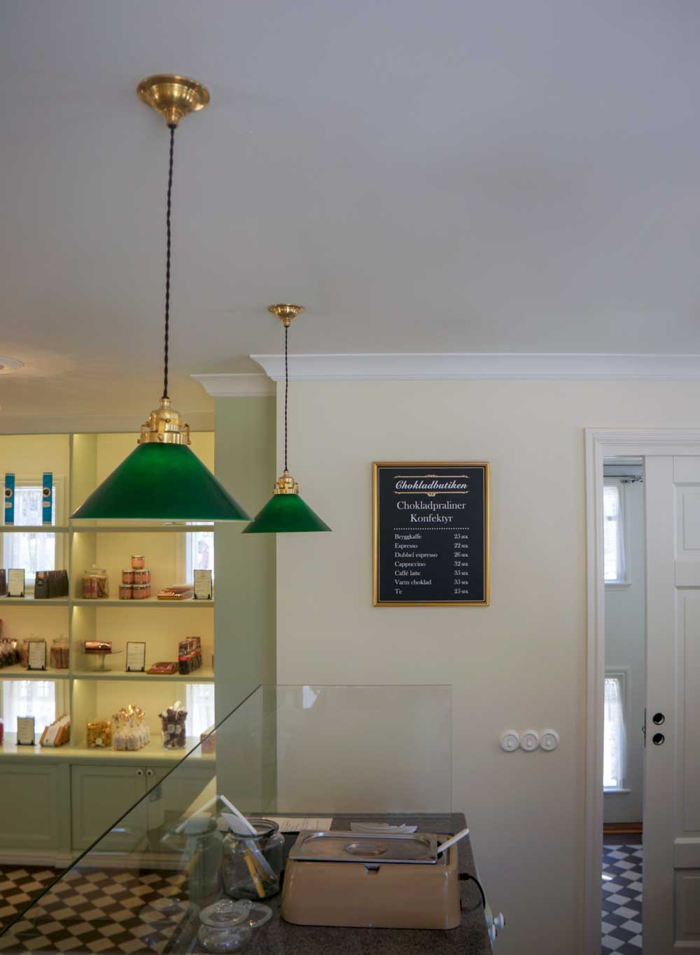 La boutique de chocolat rose avec des nœuds blancs à Astrid Lindgrens Värld à Vimmerby a été à la fois agrandie et rénovée. Au-dessus du comptoir, pendent désormais quatre lampes de cordonnier en laiton avec du verre opale vert et un cordon en tissu torsadé. Au plafond, se trouvent plusieurs plafonniers Fröding, avec des rosaces de plafond assorties, qui éclairent le reste de l'agencement ancien de la boutique. La boutique est encadrée par des étagères vert menthe et un sol en damier.