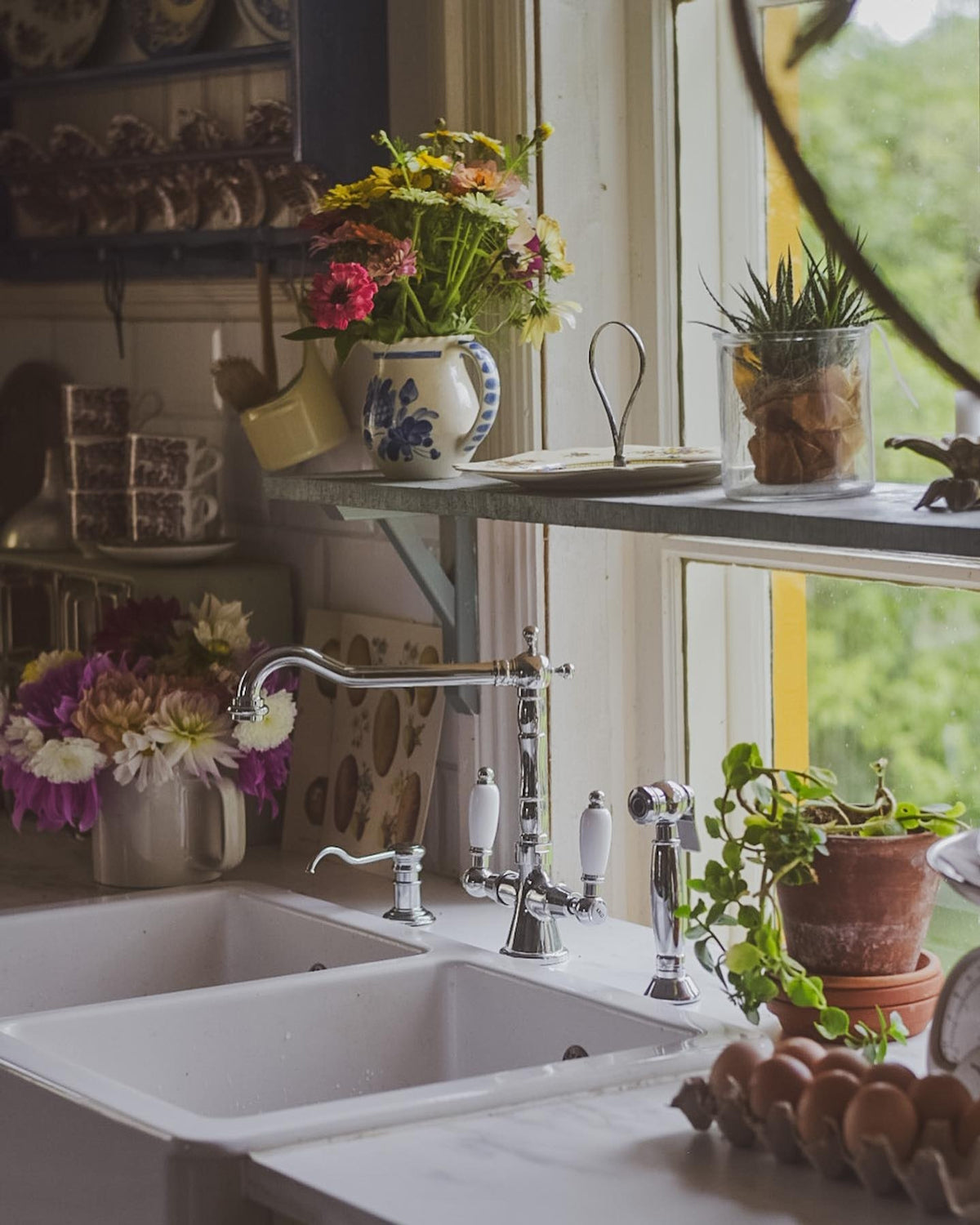 Dans la ferme, Lina Ingvarsson a choisi des lampes d'extérieur classiques et des détails de style d'époque tels que des mélangeurs de cuisine et des distributeurs de savon pour créer un ensemble harmonieux où l'histoire de la ferme rencontre la beauté fonctionnelle.