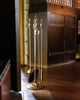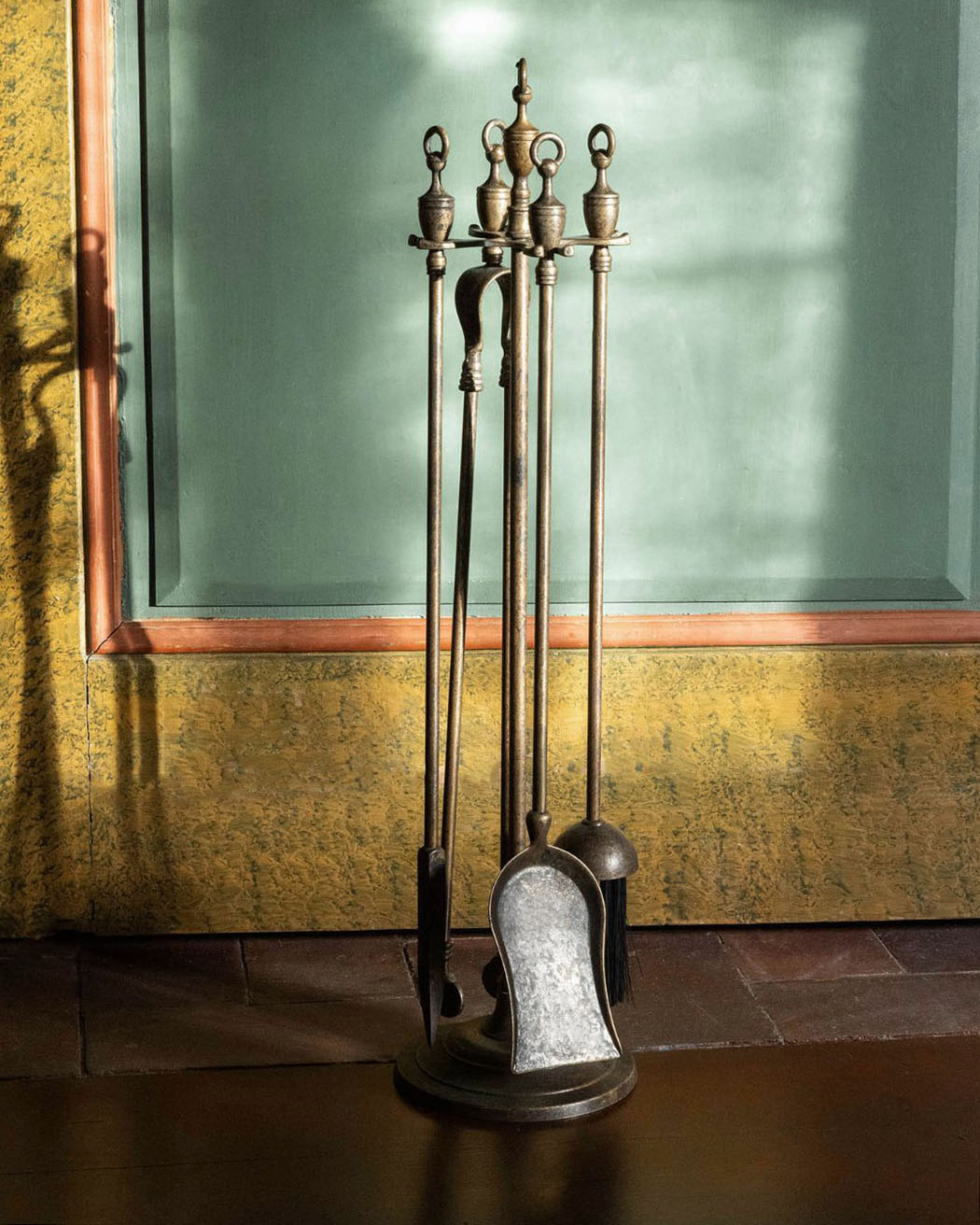 Ensemble de cheminée classique avec quatre outils de feu : brosse, pelle, pince et tisonnier.