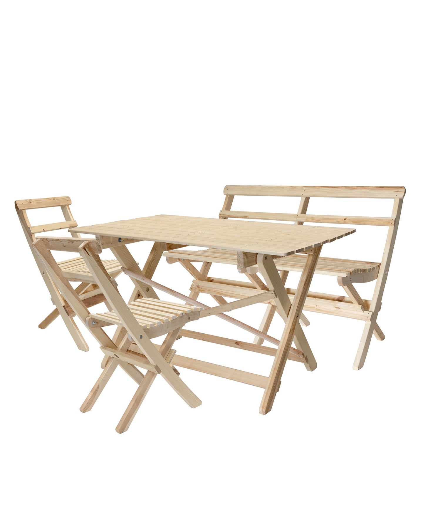 Classic garden set made of untreated pine, made in Sweden based on an old design from the 1920s. The set consists of two chairs, a bench, and a foldable table.