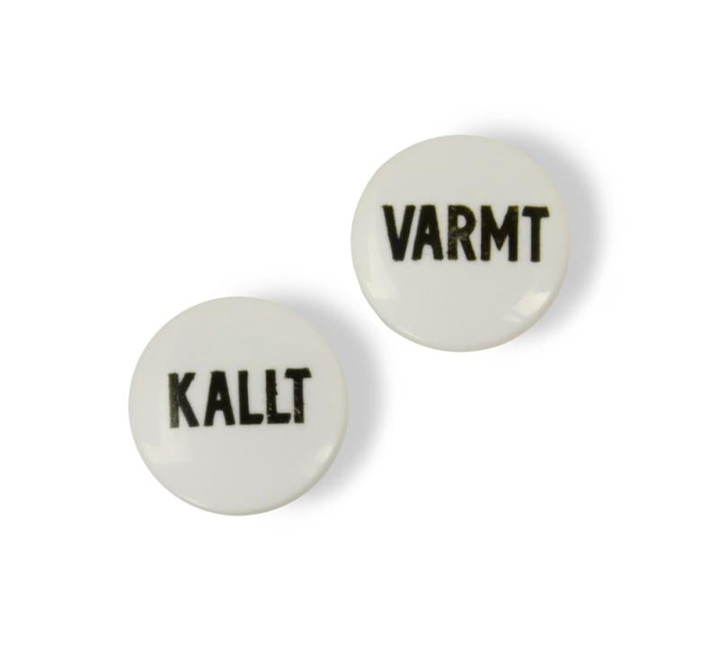 Index discs for mixer knobs made of so-called resin, an imitation of porcelain. These index discs feature Swedish text ("Kallt" and "Varmt", meaning "Cold" and "Hot") and are suitable for mixers in the Kensington, Islington, and Chelsea series.