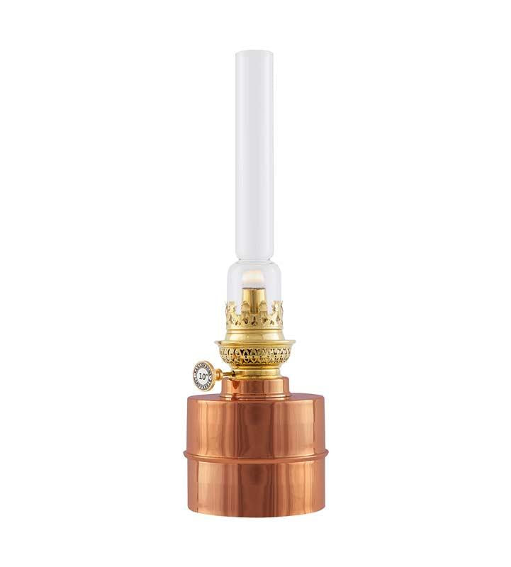 The Flaggskär kerosene lamp is a typical utility lamp from the late 1800s. With its streamlined design, it also fits in more modern interiors, especially in its nickel-plated and copper-plated versions. Flaggskär is made of solid copper-plated brass. The glass cover is made by hand (mouth-blown). The lamp is powered by kerosene (also known as lamp oil), which can be refilled by unscrewing the kerosene burner.