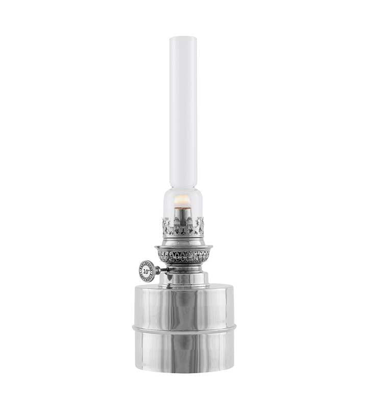 The Flaggskär kerosene oil lamp is a typical utility lamp from the late 1800s. With its streamlined design, it also fits in more modern interiors, especially in its nickel-plated and copper-plated versions. Flaggskär is made of solid nickel-plated brass. The glass cover is made by hand (mouth-blown). The lamp is powered by kerosene (also known as lamp oil), which can be refilled by unscrewing the kerosene burner.
