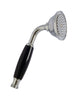 Classic hand shower with black handle made of so-called resin (porcelain imitation plastic) and the other parts in chrome-plated metal. The connection is an R15 thread, which is standard and can therefore be connected to almost any shower hose. The spray head itself has a diameter of 77 mm (3 in).