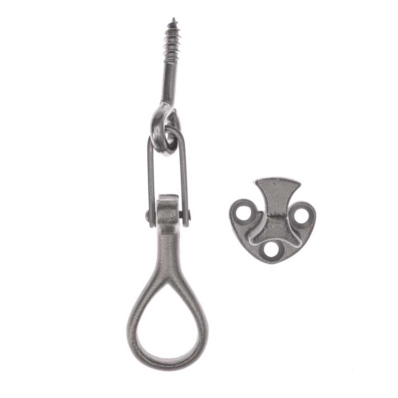 Old-style window lock for outward opening windows. The hook is attached to the frame and the lock is attached to the window frame.