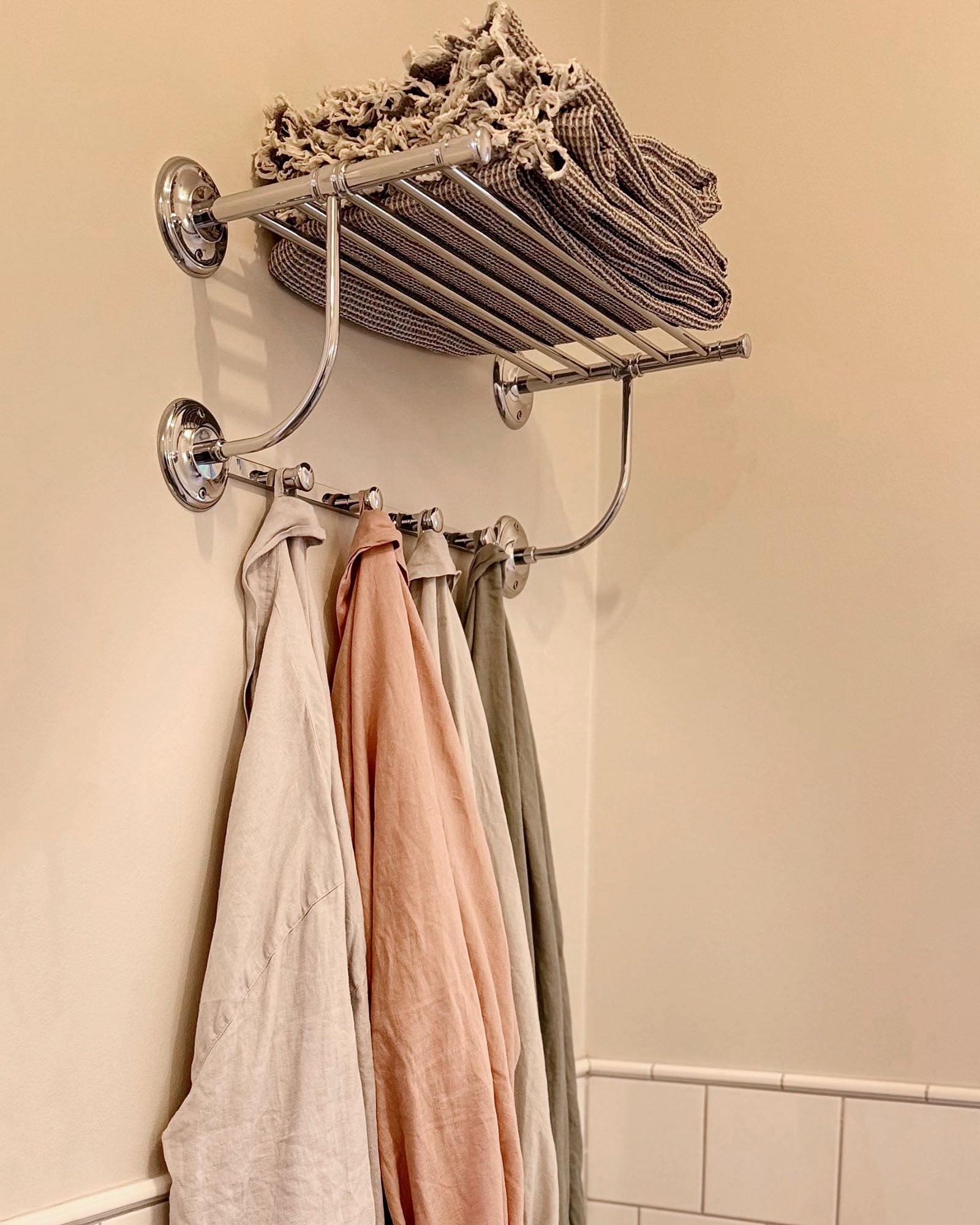 Étagère pratique, une bonne alternative au sèche-serviettes. L'étagère est dotée de quatre crochets pratiques sur le dessous et est fabriquée en laiton chromé.