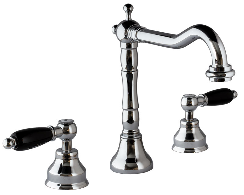 Chelsea er et vakkert trehulls servantbatteri med to svarte spaker for henholdsvis kaldt og varmt vann. Blandebatteriet passer i standard 35 mm hull og kobles til med standard 10 mm slanger som følger med. Det har keramisk pakning og leveres komplett med matchende bunnventil. Krana passer i standardhull for trehullsblandere: 30 mm på sidene og 35 mm hull for tuten. For detaljmål, se bilde.