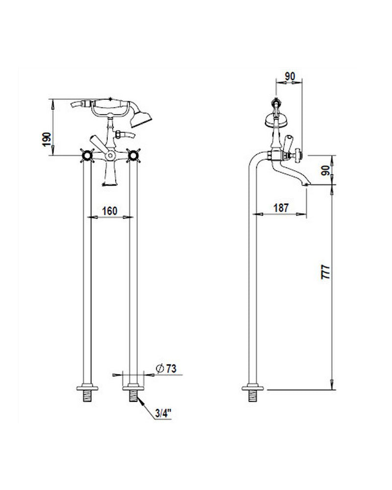 Coventry badkarsblandare på golvmonterade ståndarrör med handdusch och slang, tillverkad av franska Horus. Badkarsblandaren har moderna keramiska ventiler medan designen i övrigt är klassisk. Den guldpläterade mässingen oxiderar inte utan behåller sin blanka yta över tid. De vita detaljerna på blandaren är av äkta porslin.