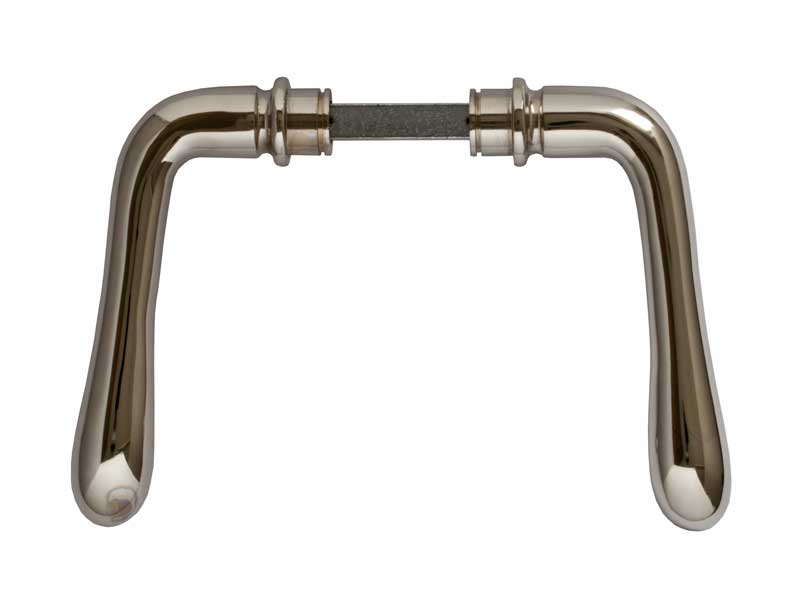 Klassiskt dörrhandtag i förnicklad mässing, tillverkat efter gammal förlaga.