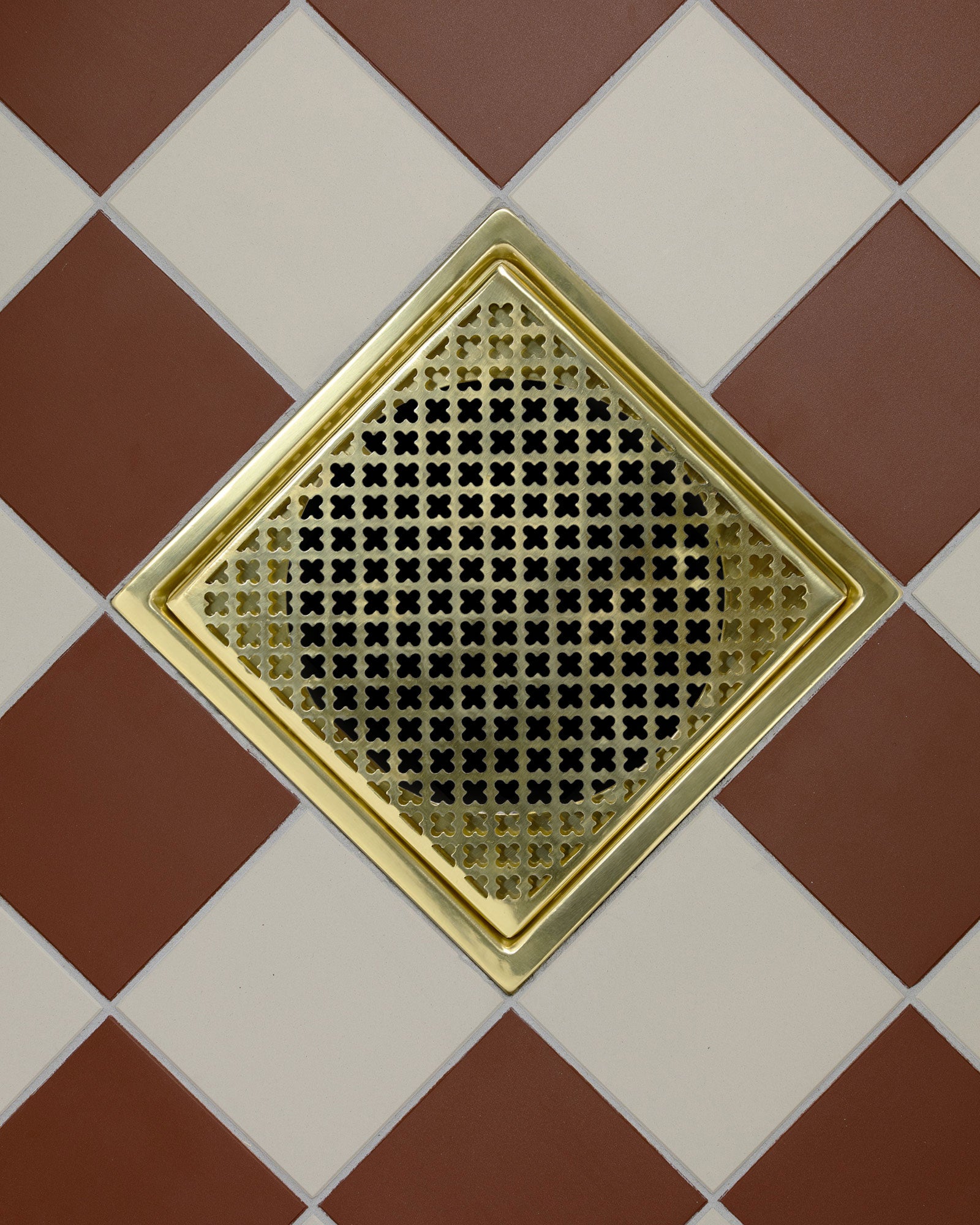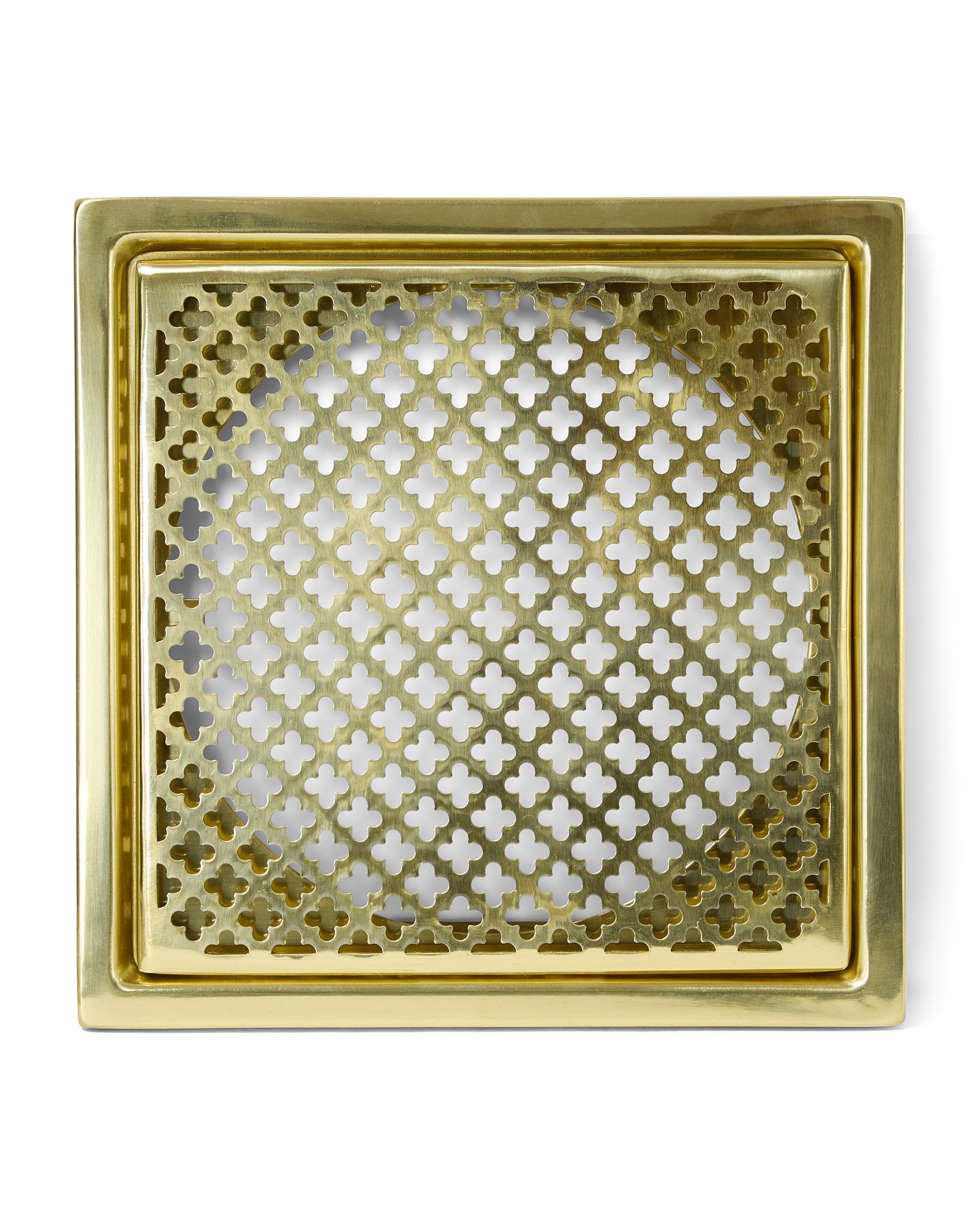 Golvbrunn i obehandlad mässing med klövermönster. 200 x 200 mm.