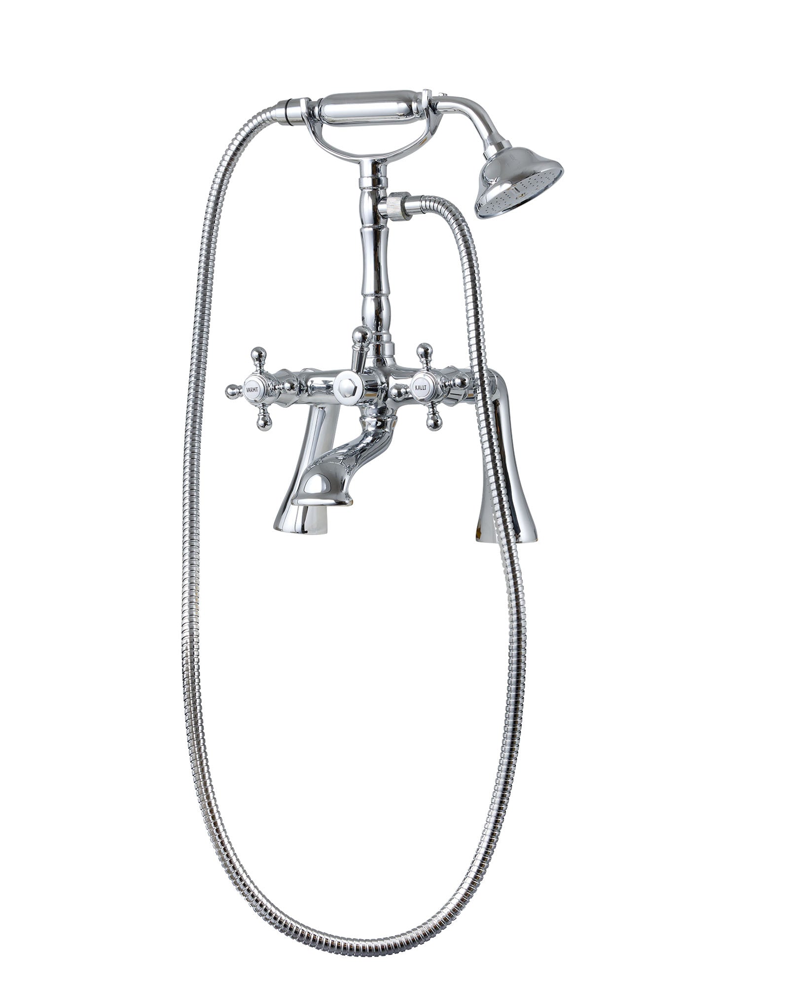 Vacker gammaldags badkarsblandare med handdusch och ben för däckmontage. Blandaren har 150 mm c/c-mått (+/- 22 mm), vilket är viktigt att informera installatören om. Blandaren är utrustad med moderna keramiska packningar och är avsedd för installation på badkarskant eller annan plan yta.