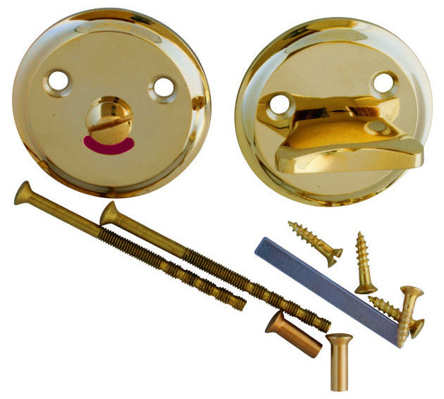 Komplett WC-lås i obehandlad mässing för moderna toalettdörrar. Då låset ej är skyddslackat kommer det att mörkna och åldras naturligt med tiden. Skyltens utsida visar vit symbol för ledigt och rött för upptaget. I denna kompletta sats ingår träskruvar samt genomgående skruvar (M4).