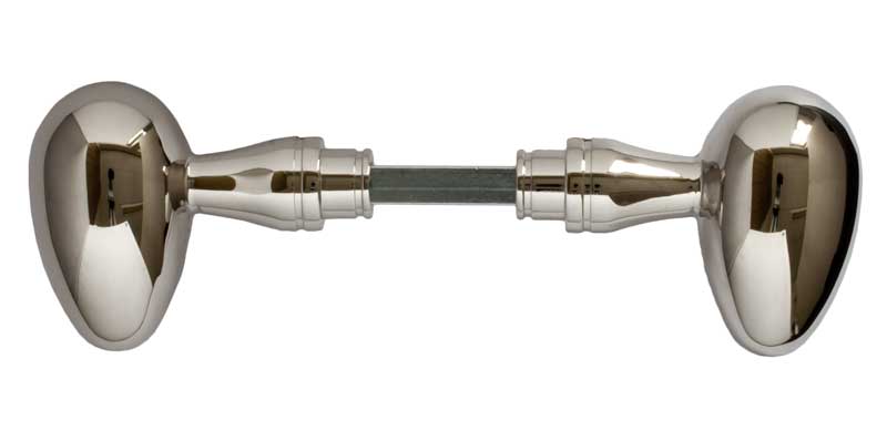 Gammaldags dörrhandtag i förnicklad mässing, tillverkad efter äldre förlaga.