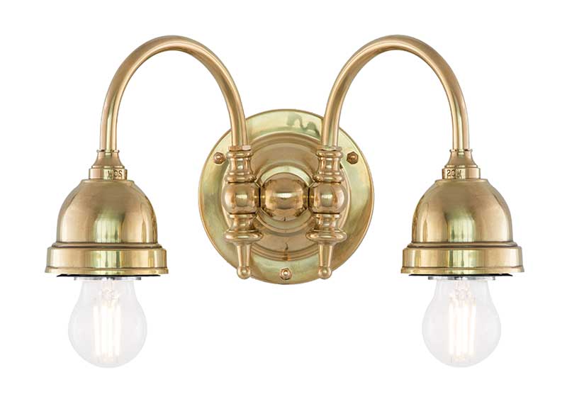 Klassisk tvåarmad vägglampa för badrum i mässing. IP-klass 21.