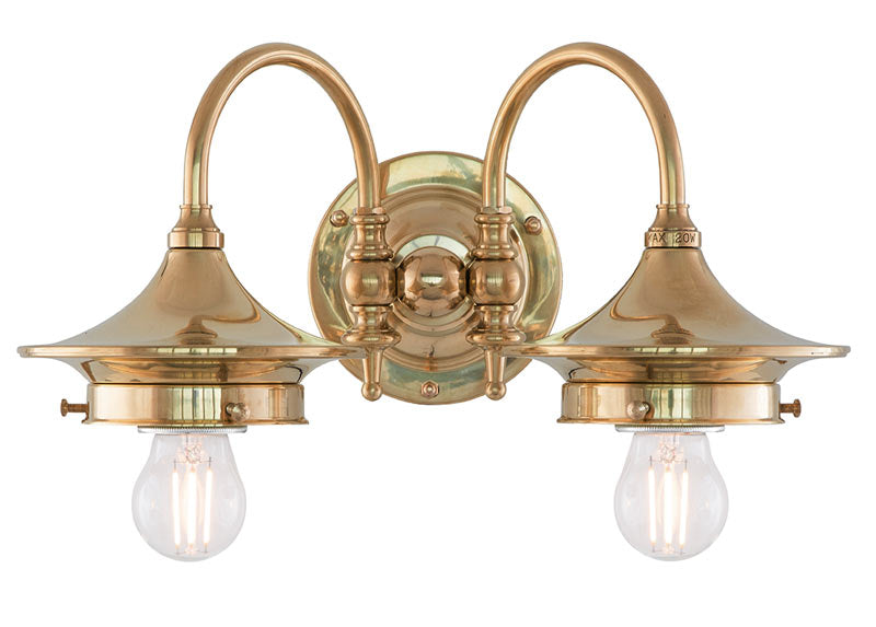 Tvåarmad vägglampa i mässing utan skärmar.
